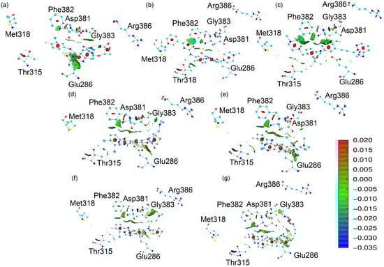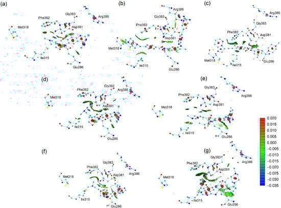NCI analysis based on promolecular densities of the docked conformations of the ligands in the 1OPJ protein. (a) afatinib, (b) imatinib, (c) ponatinib, (d) AFA(I), (e) AFA(II), (f) AFA(III), and (g) AFA(IV).
