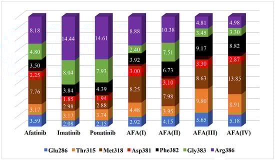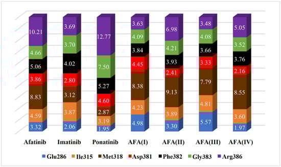 According to the docking study, AFA(IV) has no significant difference from imatinib, with only 0.1 kcal/mol of interaction energy difference, and it failed to achieve a score at the same level as ponatinib. However, AFA(IV) achieved the purpose of this study, which was to improve the score and interactions of afatinib for the mutated protein. This low score may be explained by the absence of interaction with the Met318 residue, deemed important for effective inhibition [22]. As shown in the wild-type protein, meaningful interactions tend to be established in regions with some degree of f− isosurface population, with some examples being the amine and amide groups in AFA(I), the amine and carbonyl groups in AFA(II), the amide group in AFA(III), and the methylpiperazine ring in AFA(IV). Although AFA(IV) established a hydrogen bond with the Asp381 residue, AFA(IV) interacted as an H-bond donor instead of an acceptor as in ponatinib. This may be contributing to the lower scores of the derived molecules.