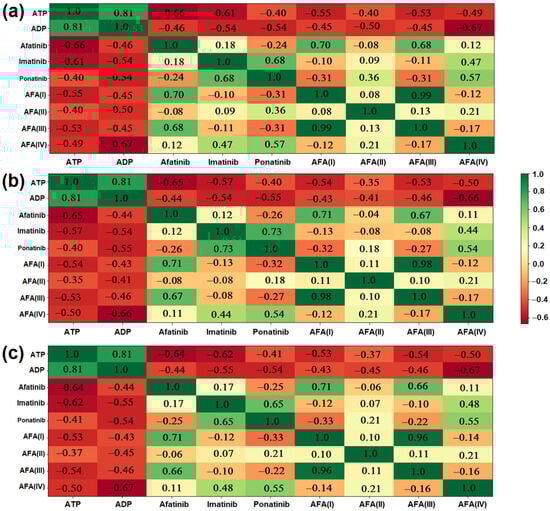 Heat maps showing the overall similarity between the derived molecules and the established inhibitors: (a) General similarity considering molecular descriptors; (b) General similarity considering molecular descriptors associated with the binding energy performance regarding the wild-type enzyme; (c) General similarity considering molecular descriptors associated with the binding energy performance regarding the mutated enzyme.