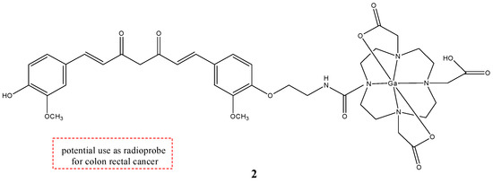 The mechanism of entrance of CUR and its derivates inside the cell is not known thus far, but CUR was investigated as a potential novel vitamin D receptor (VDR) ligand. CUR binds directly to and activates VDR, playing a role in colon cancer chemoprevention [33]. Complexes 1a–c have a good stability in phosphate buffer solution (PBS) and human serum; however, they are rapidly degraded in human blood. For this reason, a new gallium-68-labeled CUR derivate (2), named 68Ga-DOTA-C21, was also studied (Figure 3) [34].
