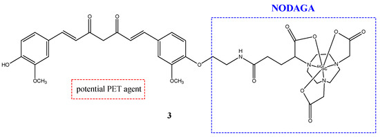 Scandium-44, as well as gallium-68, was used to study new possible radioprobes with curcuminoids derivates. Scandium-44 is a β+-emitting radionuclide and has a half-life four times longer than gallium-68 (3.97 h) [28]. Two curcuminoid complexes with scandium-44 were synthetized and studied. The first compound was NODAGA-C21 (3), in which the chelator was 1,4,7-triazacyclononane,1-glutaric acid-4,7-acetic acid (NODAGA) (Figure 4); while the second compound was AAZTA-C21 (4), which used 1,4-bis(carboxymethylperhydro-1,4-diazepine (AAZTA) (Figure 5) [30].