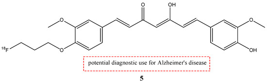 Nowadays, the most used radionuclide for PET imaging is fluorine-18, positron-emitting radionuclide (Eβ, max = 634 keV, 109.8 min) [28]. Ryu E.K. et al. synthesized one of the first 18F-labeled curcumin derivatives: (1E,4Z,6E)-1-(4-(3(-[18F]fluoropropoxy)-3-methoxyphenyl)-5-hydroxy-7-(4-hydroxy-3-methoxyphenyl)-hepta-1,4,6-trien-3-one (5) (fluoropropylcurcumin; FP-curcumin) (Figure 6) [35].