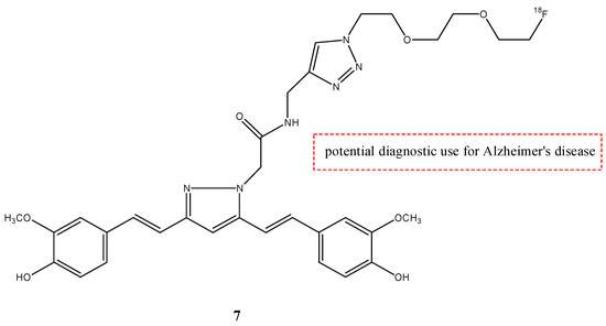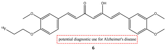 This curcumin derivate has a high affinity for β-amyloid plaques, so it was chosen as a possible radioprobe for PET for Alzheimer’s disease. The biodistribution and the pharmacokinetics of compound 6 in normal mice were comparable to those of compound 5. At 2 min post-injection, more radioactivity was accumulated in the lungs, liver, and spleen, but then rapidly decreased over time. On the contrary, the brain uptake of 6 was 2.7-fold higher than the uptake of 5 at 2 min post-injection (1.44% ID/g) and grew to 4.1-fold at 30 min post-injection (0.45% ID/g). From these results, the high lipophilicity of 6 was shown, and this feature allowed a higher BBB permeability. These features allow us to consider that molecule 6 could be a potential radiotracer for the imaging of β-amyloid plaques, but other studies are warranted [28].