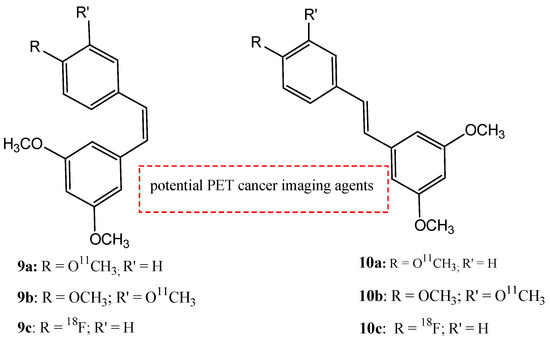 AhR is an intracellular, ligand-dependent, transcription factor that modulates the expression of a lot of genes in many tissues and species [56]. Some stilbene derivates were labeled with carbon-11 and fluorine-18 to develop six potential targets to monitor AhR expression as PET cancer imaging agents [57]. The six stilbene derivates shown in Figure 12 are cis-3,5-dimethoxy-4′-[11C]methoxystilbene (9a), cis-3,4′,5-trimethoxy-3′-[11C]methoxystilbene (9b), trans-3,5-dimethoxy-4′-[11C]methoxystilbene (9c), trans-3,4′,5-trimethoxy-3′-[11C]methoxystilbene (10a), cis-3,5-dimethoxy-4′-[18F]fluorostilbene (10b), and trans-3,5-dimethoxy-4′-[18F]fluorostilbene (10c).
