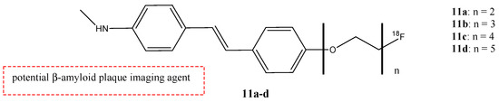Zhang et al. analyzed the potential use of 18F-labeled polyethyleneglycol (PEG)-stilbene derivates 11a–d as potential β-amiloid plaque imaging probes for PET (Figure 13) [58]. In these molecules, the radionuclide 18F is linked to the stilbene with a PEG chain with a range of ethoxy groups from two to five. The use of PEG groups in the stilbene chemical structure was important to lower the lipophilicity and improve bioavailability. These new fluorinated stilbene derivates showed an excellent binding affinity (Ki = 2.8–5.2 nM). The addition of two to five PEG units does not change the binding affinity. These stilbene derivates showed an appropriate range of lipophilicity (logP value was 2.52, 2.41, 2.05, and 2.28 for n = 2–5, respectively) and they penetrated the BBB with an excellent uptake in the brain of normal mice (6.6–8.1% dose/g brain) with a 2 min post-intravenous injection. Compounds 11a–d have been studied in normal mouse brains, and they showed an initial uptake and a rapid wash out (1.2–2.6% dose/g brain) at 60 min post-intravenous injection. This feature is possible because in normal mouse brains, there are no β-amyloid plaques, and so these showed that these radiolabel agents could be used as β-amyloid plaques-targeting imaging agents. The PEG chain showed an efficient prosthetic group for 18F labeling. The fluorinated PEG stilbene derivates showed an excellent binding affinity towards Aβ plaques and also a good penetration of the BBB [58].
