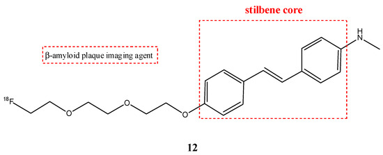 An important radiopharmaceutical 18F-labeled stilbene derivate is florbetaben (12) (also named 18F-BAY94-9172 or 18F-AV1/ZK and trans-4-(N-methylamino)-4′-{2-[2-(2-[18F]fluoro-ethoxy)-ethoxy]-ethoxy}-stilbene), which is used as a positron emission tomography tracer to discover β-amyloid plaques in brains with AD (Figure 14). Florbetaben showed a good high affinity and specificity in vitro for β-amyloid plaques [59]. In fact, the most common adverse reaction can be erythema, irritation, and pain [60]. Florbetaben (12) binds to plasma proteins and it is metabolized by CYP enzymes, especially the CYP4F2, which carries out N-demethylation, while the formation of polar metabolites was executed by CYP2J2 and CYP3A4. Florbetaben is safe and well tolerated; it is used to monitor the therapy of the AD [41] and is also studied for PET imaging in the diagnosis of cardiac amyloidosis [61]. It has a suitable pharmacokinetic: florbetaben is eliminated from plasma primarily via the hepatobiliary system, with a mean biological half-life of ~1 h. In total, 26–36% of the radioactivity that is injected is eliminated in urine up to 12 h post-injection [42].