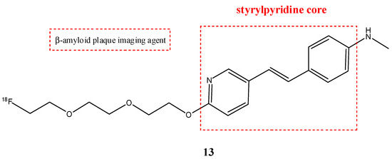 Florbetapir (13) (also called 18F-AV-45) is a radiopharmaceutical with a structure similar to florbetaben, with a modification of the stilbene core with a styrylpyridine moiety (Figure 15). This structural difference causes a lower lipophilicity of the molecule and shows faster brain kinetics compared with florbetaben [64]. This stilbene derivate radiopharmaceutical is also used as a PET tracer for the imaging of amyloid plaques in AD. Indeed, it showed high binding affinity and specific labeling of amyloid plaques in the cortical regions and hippocampus [65]. This radiopharmaceutical has a good ability to cross the BBB and has rapid kinetics. Preclinical studies showed that it has a quick cleaning from the blood circulation [66]. Recently, for the first time, a clinical study demonstrated that, in systemic light-chain amyloidosis, florbetapir PET/CT could detect early right ventricular (RV) amyloid before changes to RV structure and function occur. This study showed that RV dysfunction and poorer RV structure and function are all predicted by elevated RV amyloid on florbetapir PET/CT. These findings suggest that RV amyloid plays a key role in the pathophysiology of RV dysfunction and that florbetapir can also be used in the diagnosis of cardiac amyloidosis as florbetaben [67].