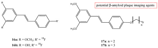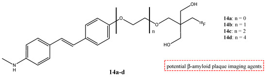 Four 18F fluorinated stilbene derivates (14a–d) were analyzed, adding a neopentyl glycol side chain (NGS) (Figure 16) [68]. These molecules could show their potential use as compounds for PET imaging of β-amyloid in Alzheimer’s disease. The stilbene moiety was used and chosen because it has a relatively planar conformation that is important for binding β-amyloid, and the introduction of the NGS group seemed to have a better effect on the affinity.