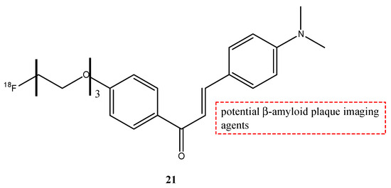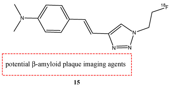The fluoroethyl (17a) and fluoropropyl resveratrol derivates (17b) showed an excellent binding affinity (Ki = 0.74 nM and Ki = 049 nM). The O-demethylation at the 3,5-positions of compound 16b (Ki = 39.7 nM) decreased the binding affinity with respect to compound 16a derivate (Ki = 4.91 nM). This suggests that methoxy groups at the 3,5-positions are important to have a high binding affinity to β-amyloid (1–42) aggregates. Furthermore, the styryltriazole derivative 15 showed a great binding affinity to β-amyloid (1–42) aggregates (Ki = 12.8 nM). From these results, compounds 15 and 17b were chosen to radiolabel with 18F: compound 15 was chosen because it has a triazole moiety and showed a lower binding affinity than resveratrol derivates 16a, 17a, and 17b; and compound 17b was chosen because it showed the highest binding affinity value. The partition coefficients of these two molecules [18F]15 and [18F]17b were studied, and their values of log p were 1.74 and 2.84, respectively. These results suggest a favorable brain permeability. From these results, [18F]15 could be a potential radioligand for β-amyloid plaque imaging, because it showed a high initial uptake and a fast wash-out from normal mouse brains with respect to [18F]17b, which showed slow pharmacokinetics in normal mouse brains with metabolic defluorination, despite [18F]17b showed the highest binding affinity to β-amyloid (1–42) aggregates [69].