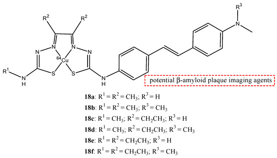 Noor et al. analyzed the use of the radionuclide copper-64 (64Cu) to form some stilbene derivative complexes (18a–f), as shown in Figure 19 [68]. Copper-64 is a positron-emitting radionuclide that has a radioactive half-life of 12.7 h, and it is easy to transport it to facilities remote to the production site. They studied the bis(thiosemicarbazonato)-stylbenyl complexes of copper-64 18a–f to have potential radioprobes that bind to amyloid-β plaques for diagnosis with imaging of AD. Tetradentate bis(thiosemicarbazonato) was conjugated to stilbene functional groups to form charge-neutral and lipophilic complexes with copper radionuclides.