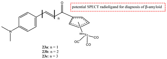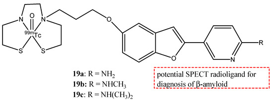 With regard to neurological diseases, three novel benzofuran derivates, 19a–c (Figure 21), were studied as potential probes for imaging for AD [74]. These radio probes have the radionuclide 99mTc (T1/2 = 6.01 h, 141 keV), which is a radioisotope used in nuclear medicine as γ-emitting for SPECT.