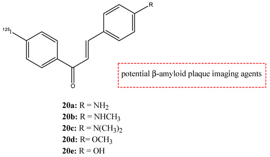 - Capponi, P.C.; Mari, M.; Ferrari, E.; Asti, M. Radiolabeled Chalcone Derivatives as Potential Radiotracers for β-Amyloid Plaques Imaging. Molecules 2023, 28, 3233. [Google Scholar] [CrossRef]
