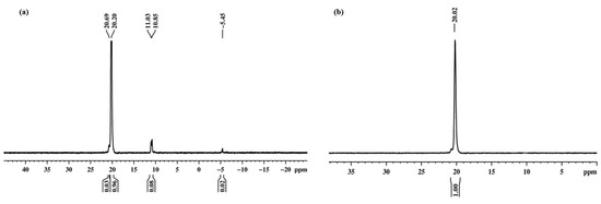 In the 31P{H} NMR spectrum of the reaction product (BPClTEA) obtained at a molar ratio of 1:1 (Figure 1a), there are signals at 20.69 ppm, 20.20 ppm, 11.03 ppm, 10.85 ppm, and −5.45 ppm with integral intensities 0.03, 1.00, 0.08, and 0.02, respectively. The signals at 20.69 ppm and 20.20 ppm are characteristic of the mono and diesters of phenylphosphonic acid [29,30]. The signals at 11.03 ppm and −5.45 ppm should be attributed to phenylphosphonic acid [31] and pyrophosphonate structures [31], respectively. The 31P{H} NMR spectrum of the reaction product (2BPClTEA) obtained at a molar ratio of 2:1 (Figure 1b) showed a signal at 20.02 ppm. The signals at 20.20 ppm (molar ratio 1:1) and 20.02 ppm (molar ratio of 2:1) have a significantly stronger integral intensity, which gives us reason to attribute them to the phosphorus atom in the repeating unit of I and in di[bis(2-hydroxyethylterephthalate)] phenylphosphonate II. The phosphorus atoms in both products have the same surroundings.