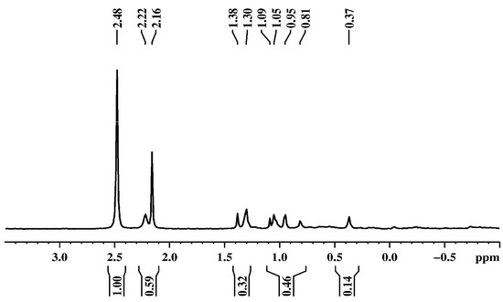 The data from the 31P{H} NMR analysis show that the additional increase in the reaction time does not lead to significant changes in the content of the reaction products. The intensity of the signal at 2.70 ppm increases from 28.70% up to 30.10%. The presence of two signals gives us reason to assume that in the reaction mixture, there are two phosphorus-containing compounds with different amounts but with a very similar structure of the substituents at the phosphorus atom.