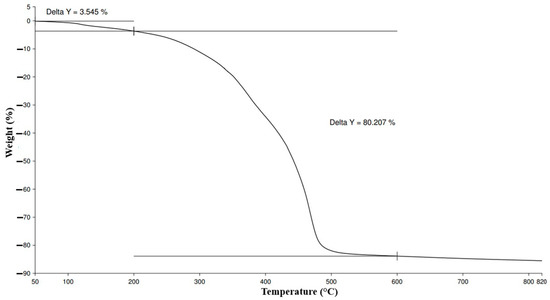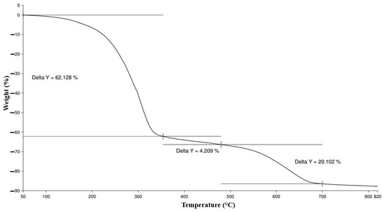 From the TGA data of the reaction product from the interaction between GP-PET and TMP (Figure 7), it is obvious that the decomposition of the sample proceeds in three stages as follows: the first stage is at 360 °C, which refers to the weight loss of 62%; in the second (at 500 °C) and third (at 700 °C) stages, the losses are around 25%. The remaining residue at 800 °C is about 13%.