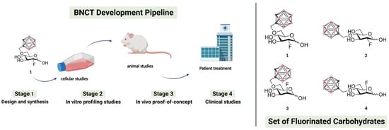 Left panel: a schematic representation of the four main stages of a BNCT development pipeline (figure created with Biorender.com). In this work we focus on stages 1–2. Right panel: chemical structures of the fluorinated carbohydrates targeted in this work. Substrates 1–2 are based on the FDG backbone whereas 3–4 are based on the FDM backbone. In the ortho-carboranylmethyl moiety, black/grey dots represent carbon atoms while pink dots represent boron atoms.