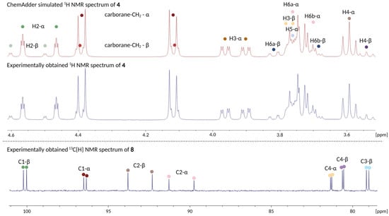 In short, the anomeric protons and carbons and those of the 6th position in carbohydrates are easily identified in the 1H and 13C NMR spectra, respectively, through the use of Ed-HSQC. The H-1–H-2 coupling constants can be utilized to distinguish which anomer is α and β in the FDG backbone but for FDM-derivatives the situation is different. Here, in addition to analyzing the H-1–H-2 coupling constant, the location of the H-3/H-5 protons need to be considered [31,32]. We employ 1D-TOCSY on well separated signals in each anomer in order to isolate the individual 1H spin systems of the anomers present in the mixture. Once the locations of protons in each spin system are known, COSY can be utilized to identify the chemical shifts of neighboring protons in the backbone i.e., H-2 and H-5 from the starting point presented above. These can in turn be utilized to identify the remaining protons in the carbohydrate backbone i.e., H-3 and H-4. Ed-HSQC can then be utilized to identify the corresponding carbon atoms and, once these signals are resolved, HMBC can be utilized to identify the location of substituents, such as protective groups or the carboranylmethyl substituent. While a rough estimation, and at times complete characterization, of 1H and 13C NMR spectra is possible based on these techniques alone, in complex 1H NMR spectra with overlapping signals and higher order effects these techniques are not always sufficient if the aim is to obtain accurate chemical shifts and coupling constants. In such cases, the use of QMSA provides a good outlet for going beyond what is possible otherwise. As mentioned above, we have used the ChemAdder program for these purposes. A testament to the accuracy of this program is given in Figure 2 by comparing the experimental and simulated 1H NMR spectra of 4 (see Figure 2, top).