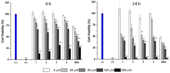 Cell cytotoxicity studies in the CAL 27 cell line measured at two different time points, 6 h (left) and 24 h (right) over a concentration range of 5–250 μM. The complete cell culture medium containing 1% v/v DMSO was used as a negative control for cytotoxicity (blue bar) and 1% v/v Triton X-100 (red bar) as a positive control for cytotoxicity. The cytotoxicity of glycoconjugates 1–4 as well as BSH were measured. Results are represented as the mean ± s.d. (n = 4) in comparison with the negative control. The statistical significance was analyzed using an unpaired Student’s t-test, where the significance was set at * p < 0.05, ** p < 0.01, and *** p < 0.001.