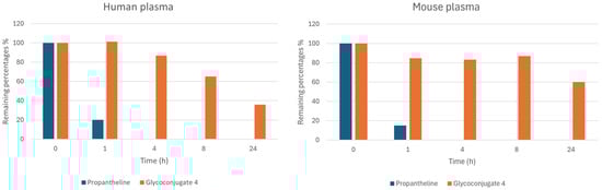 Human and mouse plasma stability of glycoconjugate 4 and propantheline over a 24-h period at a set concentration of 50 μM for 4 and 5 μM for propantheline.