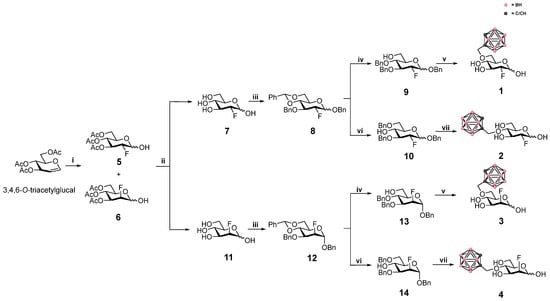 Carbohydrate-based delivery agents for BNCT have been developed and explored by a number of research teams over the past decades [19,20]. Nevertheless, the selection of target molecules for the current study was based on our own dedicated synthesis and screening program in which libraries of systematically modified glycoconjugates have been produced and assessed under identical experimental conditions [7,8,9,10]. Based on these studies, the preferential position for attachment of an ortho-carboranylmethyl substituent in D-glucose is the 6th position [7]. Thus, the main objective was to synthesize the corresponding conjugate based on the FDG structural skeleton. However, while reviewing the literature and designing the synthetic routes, we noted that both “manno” and “gluco”-isomers could be accessed with the ortho-carboranylmethyl substituent in positions 4 or 6 through a more carefully devised scheme. Since small structural variations in the glycoconjugate delivery agents have previously been accompanied by differences in in vitro performance, the simultaneous synthesis and screening of a representative set of four fluorinated glycoconjugates was thought to be a considerable advantage over the synthesis of only one.