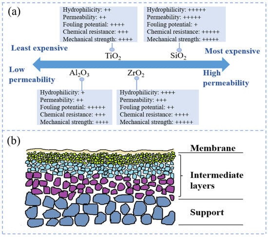 CMs are generally prepared from chemically resistant metal oxides (Al2O3, TiO2, SiO2, ZrO2, etc.) or their mixtures, and are currently the most widely used inorganic films on the market [32]. Among them, Al2O3 is a widely used ceramic material for membrane fabrication. Al2O3 membranes have high strength, chemical stability, and thermal stability, and are more economical and cost-effective [31,33]. ZrO2 membranes have a monoclinic crystalline structure at room temperature and tetragonal and cubic structure at high pressure [33]. Due to their remarkable hydrophilicity and excellent heat resistance, they are suitable for oil–water separation [34,35]. TiO2 membranes contain rutile, anatase, and limonite, and have anti-fouling and anti-bacterial properties [34]. SiO2 membranes have smaller pore sizes, are less likely to be clogged during use, and can be applied to seawater desalination [30]. Ceramic membrane materials are listed according to their chemical stability from the highest strength to the lowest as follows: TiO2 > ZrO2 > Al2O3 > SiO2 [34]. The relative properties of the aluminum (Al)-, zirconium (Zr)-, silicon (Si)-, and titanium (Ti)-based ceramic membranes are presented in Figure 1a [31]. The structure of CMs is an asymmetric structure composed of multiple layers of oxides with different pore sizes and porosities. The asymmetric structure generally has 2–3 layers, including a support layer, an optional intermediate layer, and an active layer (Figure 1b). The support layer is prepared from adhesives and gelling agents, and the support layer provides mechanical support for the membrane as well as reduces the solvent permeation resistance [36,37]. The intermediate layer is thin and porous with a pore size distribution in the range of 50–500 nm, functioning to reduce the pore size and produce a smooth membrane surface [38]. The active layer, with a thickness of less than 1 μm, determines the membrane’s porosity and is used to fulfill the separation function of the membrane [13,39].
