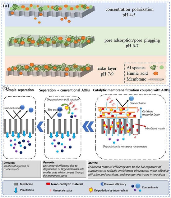 (a) The main membrane-fouling mechanisms for the three coagulants [88]; (b) schematic diagram of individual separation, separation and conventional AOPs, and catalytic membrane filtration coupled with AOPs [27].