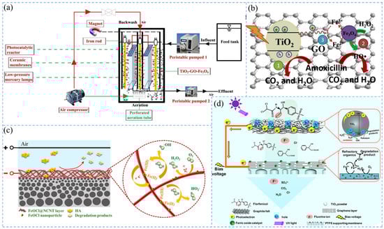 In addition, Jiang et al. [214] proposed a novel UV-driven electro-Fenton catalytic membrane (UV-EFCM) filtration system for the first time (Figure 4d). UV-EFCM used a TiO2-modified graphite felt filter (TiO2/GF) as a photoanode to treat a low concentration of florfenicol (14 μM), achieving almost complete degradation and high mineralization (78.4 ± 9.1%). This integrated system utilizes photovoltaic electronics to save energy requirements and is expected to be a hot research direction in the future.