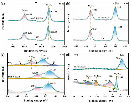 XPS spectra of the ZIS, FeS2, and 8%FeS2@ZIS heterostructure: (a) Zn 2p, (b) In 3d, (c) S 2p, and (d) Fe 2p.