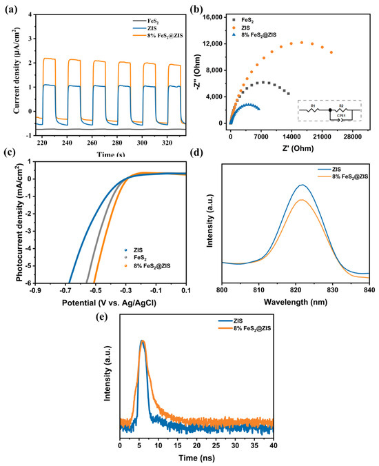 The photogenerated charge carrier separation properties of photocatalysts were evaluated by photoelectrochemistry, PL, and TR-PL testing. As shown by the i-t curve in Figure 6a, FeS2 exhibits a low photocurrent density due to the rapid photogenerated e−/h+ recombination. After the formation of the composite catalyst, 8% FeS2@ZIS shows enhanced photocurrent response compared with the pristine FeS2 and ZIS [44]. As shown in Figure 6b, the arc radius of the electrochemical impedance spectral (EIS) Nyquist plot of 8% FeS2@ZIS is smaller than that of bare ZIS and FeS2, indicating a lower interfacial charge transfer resistance [45]. The EIS spectra are composed of the ohmic resistance (R1), the charge transfer resistance (R2), and the constant phase element, where the R2 value can reflect the electron transport capacity of the sample [46]. Furthermore, the fitting impedance results (Figure 6b and Table S1) show that the three catalysts have a similar R1. Relative to the bare FeS2 and ZIS, the R2 of the 8%FeS2@ZIS is significantly reduced (Table S1), indicating that the charge transfer efficiency is significantly improved after the formation of the composite catalyst. The EIS result indicates that 8%FeS2@ZIS has the strongest separation and transfer ability of photogenerated carriers, thus promoting the photocatalyst performance. As shown in Figure 6c, the catalyst surface hydrogen production dynamics were explored by the LSV test. Compared with FeS2 and ZIS, the 8%FeS2@ZIS composite has a higher photocurrent density and a lower HER overpotential at the same potential and photocurrent density, indicating that the 8%FeS2@ZIS composite has the best electron transfer efficiency as an electrode [47,48]. The rapid recombination of photogenerated carriers enhances the fluorescence of catalyst material. As shown in Figure 6d, the PL intensity of 8%FeS2@ZIS at about 820 nm is weakened compared with the pristine ZIS, indicating that the formation of the composite effectively inhibits the photogenerated carrier recombination. The TR-PL results indicate (Figure 6e) that the average lifetime of the 8%FeS2@ZIS composite (2.78 ns) is increased compared to pure ZIS (2.27 ns), indicating that the heterostructure achieves more efficient charge transfer [49]. The above analyses confirm that the separation and transfer of photogenerated carriers can be accelerated through the heterogeneous interface after the formation of heterogeneous structures so as to achieve efficient carrier utilization and, thus, improve the photocatalytic hydrogen production rate.