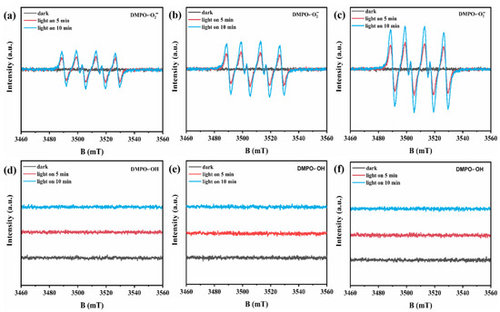 The separation efficiency of photogenerated electron/hole pairs was further revealed by DMPO radical trapping experiments with ESR spectroscopy. As shown in Figure 7a–f, no radical generation was observed in all samples under dark conditions. The conduction band positions of FeS2 (−1.90 V) and ZIS (−0.51 V) both met the formation potential of superoxide free radicals (O2 + eCB-→·O2− at −0.33 V vs. NHE), so four broad peaks of equal intensity were detected in the methanol solution after illumination, corresponding to the DMPO-·O2− signal. With the extension of illumination time, the concentration of ·O2− generated in the solution gradually increased, and thus, the peak intensity gradually increased. Since the valence band maximum of FeS2 (−0.13 V) and ZIS (1.77 V) did not meet the generation potential of ·OH (OH− + hVB+→·OH + H+ at 1.99 V vs. NHE), no DMPO-·OH signal was detected under light illumination. As shown in Figure 7a–c, 8% FeS2@ZIS exhibited a stronger ESR signal of DMPO-·O2− than that of both FeS2 and ZIS, respectively. The above analysis results show that the construction of the FeS2@ZIS heterojunction can effectively accelerate the transfer of photogenerated charge carriers, thus improving the photocatalytic hydrogen production performance.