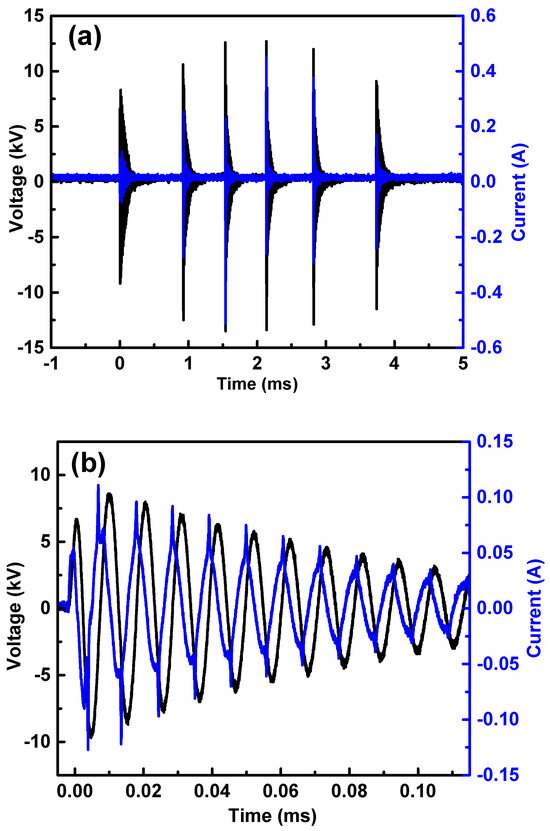 (a) Voltage and current signals of a 6-burst package; (b) detailed view of voltage and current signals into the first burst, wherein the characteristic sharp DBD signals can be observed in the current signal.