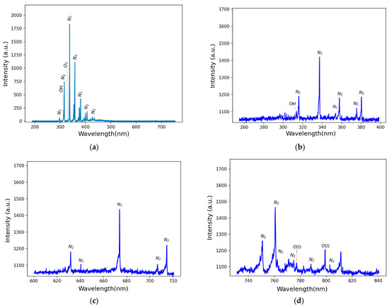 Optical emission spectrum: (a) the full spectrum from 200 to 750 nm; (b–d) more detailed spectra of N2 species for specific regions, namely 260–400 nm, 600–720 nm, and 730–840 nm, respectively.