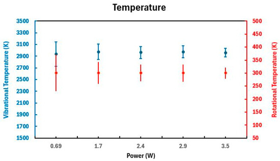 The experimental spectra acquired under diverse experimental configurations were subjected to adjustment by applying the MassiveOES GUI 1.0 software. Engineered for this purpose, the software aligns spectral simulations stored within its database with the experimentally obtained data. This process facilitates the extraction of diatomic-molecule vibrational and rotational temperatures, as Voráč et al. outlined [67]. The wavelength range of the molecular nitrogen emission selected for temperature analyses in this investigation spans 360 to 383 nm and represents the N2 emission lines from the second positive system. The outcomes of these analyses as a function of the discharge power are graphically depicted in Figure 3. Conventionally, determining the gas temperature stems from examining the system’s rotational structure (Trot). The second positive system of N2 is characterized by low energies for rotational excitation and abbreviated transition times [68], fostering equilibrium between molecules in rotational states and gas molecules. The vibrational temperature (Tvib) elucidates the vibration modes of molecules and correlates with the pace of chemical reactions. Elevated Tvib values amplify the likelihood of chemical reactions between the plasma and the target, as elucidated by Nascimento et al. [69]. Under the scrutinized experimental conditions, observations reveal a sustained rotational temperature of 300 ± 32 K (approximately 27 °C) within the reactor. Concurrently, the average vibrational temperature persists at 2961 ± 120 K, demonstrating resilience to variations in discharge power.