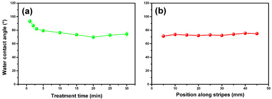(a) Mean values of water contact angle for polyethylene samples measured after APD treatment for between 1 and 30 min; (b) mean values of water contact angle measurements taken along the central axis of the samples at 5.0 mm intervals during 15 min of treatment.
