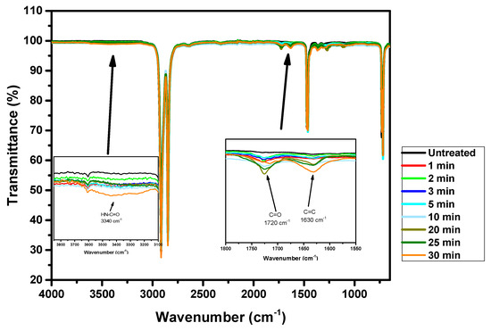 Figure 5 displays a peak at 1720 cm−1 related to C=O groups, whose intensity increases with the treatment time. A new band is also observed at approximately 1680 cm−1, attributed to the C=O stretching groups in amides [73]. However, the band at approximately 3340 cm−1 plays a crucial role. This band can be associated with stretching in the HN-C=O group [74]. The peak at 1630 cm−1 also increases with the treatment time; this peak can be attributed to C=C bands, meaning it may arise due to the formation of double bonds as a result of plasma-induced dehydrogenation or crosslinking during the treatment [75]. This confirmation is a significant step in our research, as it validates the presence of nitrogen in the plasma-treated polymers.