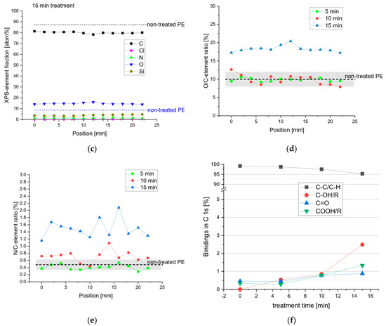 The N/C ratio of the long-term-treated PE rose from 0.5% to 1.6% compared to the untreated PE sample. Figure 6f shows the C1s binding energies. Due to the plasma treatment, the insertion of O-containing functional groups can be observed. The longer the plasma treatment was applied, the more O-containing functional groups were recognizable.