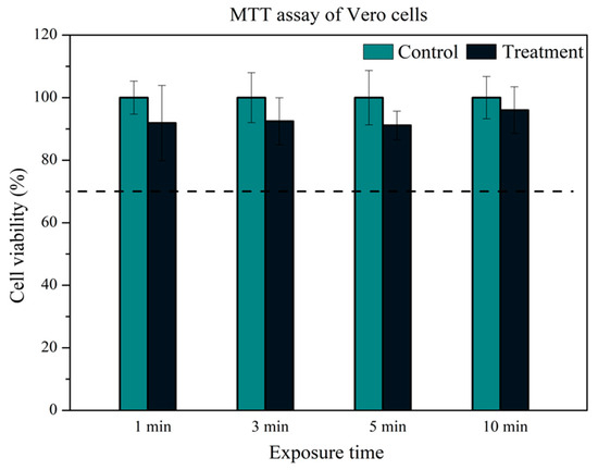 Outcomes from the MTT assay conducted on Vero cells. This graph depicts the cell viability (%) following exposure to plasma for 1, 3, 5, and 10 min, along with the corresponding control groups. The dashed line denotes the threshold of 70% cell viability.