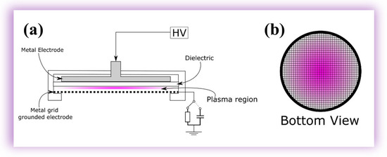 (a) DBD system schematic; (b) bottom-view illustration of the device in operation.