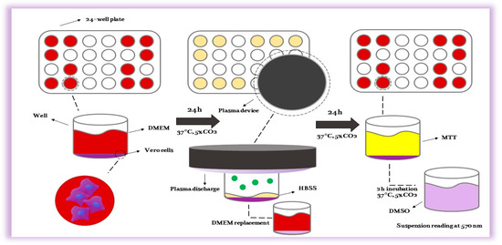 Before any microbiological testing, all components underwent sterilization using UV light exposure, with exposure for 10 min. Subsequently, a cytotoxicity test was conducted to assess the impact of the APD on Vero cells. Vero cells were cultured with the utmost care at 37 °C in Dulbecco’s Modified Eagle Medium (DMEM), supplemented with 10% inactivated fetal bovine serum, 100 IU mL−1 of penicillin, and 100 µg.mL−1 of streptomycin, in an atmosphere of 95% air and 5% CO2. The cells were seeded at a density of 4.104 cells/well in a 24-well plate, as illustrated in Figure 3, and incubated for 24 h at 37 °C [88]. After this initial incubation, the culture medium was removed, and 200 µL of Hank’s Balanced Salt Solution at pH 7.4 (HBSS) was added to each well. Subsequently, the cells underwent plasma exposure for 1, 3, 5, and 10 min, as outlined in Figure 10, while cells in HBSS without plasma exposure served as the control group.