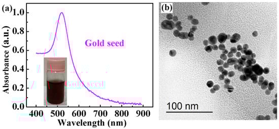 (a) The absorption spectrum of the gold seed solution (inset: gold seed solution). (b) The TEM image of gold seed nanoparticles.