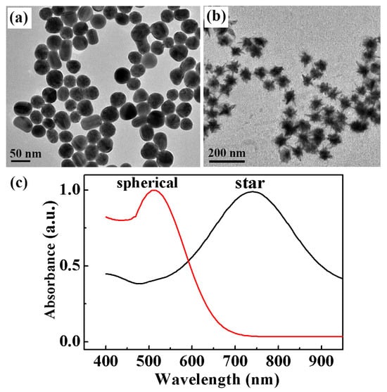 From the schematic illustration of gold nanoparticle synthesis in Figure 8, it can be seen that AgCl plays an important role in the growth of tip branches on the surface of gold nanoparticles. Once AgCl precipitates are adsorbed onto the surface of gold seed nanoparticles, the adsorption position will no longer grow. On the contrary, the sites without AgCl adsorption will continue to grow, resulting in multi-tip dendritic GNSTs. If we did not add AgNO3 when synthesizing GNSTs, the surfaces of gold seed nanoparticles grew uniformly, and finally the GNSPs were obtained. The TEM images of the GNSPs and GNSTs are shown in Figure 2a,b, respectively. It can be seen from the figure that both achieved good nanoparticle dispersion. In Figure 2a, we see that the morphology of the nanoparticles was mainly spherical, while a few non-spherical particles, such as nanorods and nanoellipsoids, appeared at the same time. A tip structure developed on the surface of the nanoparticles, as shown in Figure 2b; here, the yield of gold nanoparticles was close to 100%, and the size uniformity was excellent. Gold nanoparticles with different morphologies must have different optical properties. Subsequently, we measured the absorption spectra of two kinds of nanoparticle solutions with the help of a spectrometer, as shown in Figure 2c. It can be clearly seen from the picture that the absorption spectrum of GNSPs was similar to that of gold seed particles, and the resonance peak was near 520 nm. On the other hand, the resonance peak of the absorption spectrum of GNSTs had an obvious red shift, reaching about 750 nm. Another obvious difference was the FWHM (full width at half maxima) of the absorption spectra. Compared with that of GNSPs, the absorption spectrum of GNST had a larger FWHM. The resonance peak of metal nanoparticles can be controlled by changing their morphology and size. These control methods provide important technical support for the application of metal nanoparticles in the fields of fluorescence enhancement, SERS, optical devices, and other fields.