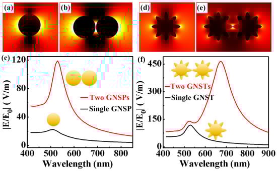 Electric field distributions on the surface of (a) a single GNSP and (b) two GNSPs. (c) Electric field resonance spectra on the surface of a single GNSP and two GNSPs. Electric field distributions on the surface of (d) a single GNST and (e) two GNSTs. (f) Local electric field resonance spectra on the surface of a single GNST and two GNSTs.