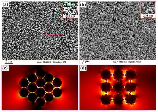 SEM images of (a) GNSP films and (b) GNST films. Images of the coupling effect within the electric field distribution for (c) GNSPs and (d) GNSTs. The insets in (a,b) are higher-magnification SEM images.