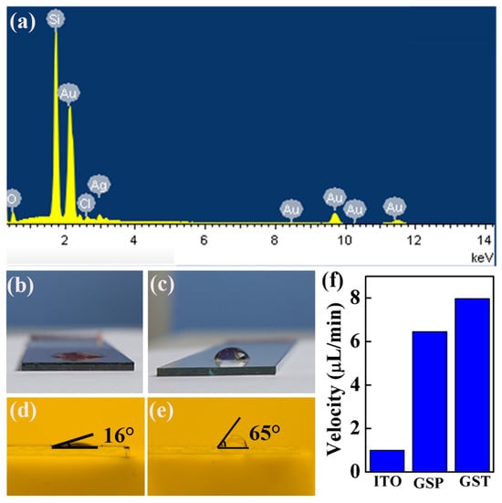 Under the excitation of incident light, plasmon excitons generated by the 3D-GNS can be converted into thermal energy. Therefore, solar light–heat utilization based on the 3D-GNS can be applied in various fields, and this technology has the advantages of green environmental protection. Next, we used the light–heat conversion characteristics of the 3D-GNS to quantitatively study its ability to accelerate water evaporation. The hope is to bring about new applications in the field of seawater desalination. In order to be consistent with actual applications, we chose a standard AM1.5 spectrum irradiation. Studies have shown that under the condition of a light source power of 5 kW/m2, the surface temperature of a 3D-GNS can increase from room temperature to above 75 °C after 5 min of irradiation, and then tends to stabilize [13]. Under the same light source irradiation conditions, the temperature of the exposed ITO glass surface did not increase much. As shown in Figure 6b, we can see that the 3D-GNS has super-hydrophilic characteristics. The exposed ITO glass has hydrophobic properties, as shown in Figure 6c. We then measured their contact angles, which were 16° and 65° for the 3D-GNS based on GNSTs and bare ITO glass, respectively. In order to test the water-volatilization ability of the 3D-GNS, we conducted a comparative experiment. A 550 W halogen lamp was used to simulate sunlight, set 10 cm away from the 3D-GNS. We took 2000 μL of water and dropped it continuously onto the 3D-GNSs based on GNSPs and GNSTs, as well as the surface of the exposed ITO glass. The surface had to be kept moist at all times during the water evaporation process. We defined the water evaporation rate as 2000 μL of water/total time of the evaporation process, and the results are shown in Figure 6f. From the results, we can see that the water evaporation rate of the 3D-GNS based on GNSTs was 8 μL/min; the water evaporation rate of the 3D-GNS based on GNSPs came second; and the water evaporation rate of bare ITO glass was the lowest, at only about 1 μL/min. Obviously, the super-hydrophilic nature of the 3D-GNS can enhance the light–heat conversion efficiency and further increase the rate of water evaporation. This offers an idea for designing purification equipment with new water evaporation methods.