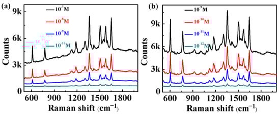 In Figure 3, it is shown that the local electric field intensity in the gap region between gold nanoparticles is much greater than the intensity on the surface of a single gold nanoparticle. The 3D-GNSs we prepared were composed of a large number of gold nanoparticles close to each other, and a large number of gap structures were formed between the nanoparticles. Under the excitation of incident light, the electric field in the gap region was greatly enhanced due to the hot spot effect. Therefore, the 3D-GNSs are very suitable for use as a SERS substrate for the Raman signal detection of organic molecules. As shown in Figure 7a, we measured the Raman signal of R6G molecules based on a 3D-GNS SERS substrate of GNSPs. It can be seen from the figure that the intensity of the Raman spectral signal of R6G molecules decreased with the decrease in the molecular concentration, and the limit concentration of R6G molecules was 10−10 M. Under the same test conditions, we also tested the Raman spectral properties of 3D-GNS SERS substrates based on GNSTs. We found the same trend as shown in the figure, that is, the higher the concentration of R6G molecules, the stronger the Raman spectrum signal obtained. However, the lowest test concentration for testing the Raman signal of R6G molecules based on the 3D-GNS structure SERS substrate of GNSTs was 10−12 M. The results show that the 3D-GNSs composed of GNSTs had stronger local electromagnetic field enhancement characteristics than those composed of GNSPs, which is consistent with the simulation results shown in Figure 3.