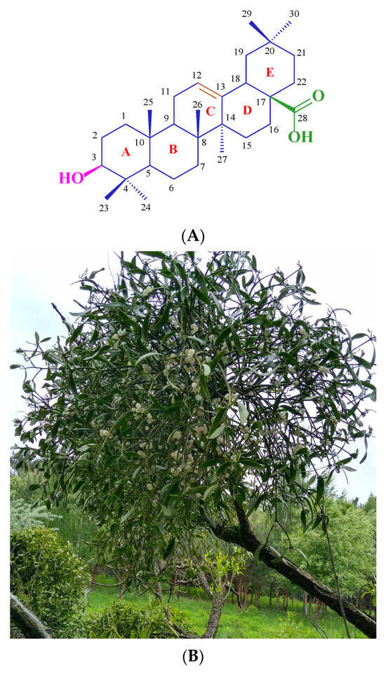 (A) Structure of oleanolic acid (1) and (B) one of the sources of this compound—mistletoe (Viscum alba) herb.