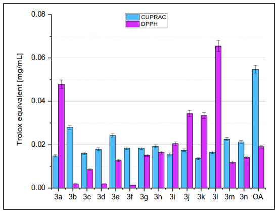 The results of the antioxidant activity of oleanolic acid (1) and Acetylated Oleanolic Acid Dimers (AcOADs) 3a–3n evaluated with CUPRAC and DPPH assays [42,46] are given in Figure 3. The results are presented as % inhibition of the copper(II) ions and Trolox equivalent (blue bars) calculated from the standard curve, presented in the Supplementary Materials (Supplementary Materials S02, Figure S1) and as % inhibition of the DPPH radical and Trolox equivalent (pink bars), calculated from the standard curve presented in the Supplementary Materials (Supplementary Materials S02, Figure S2).
