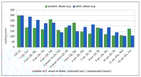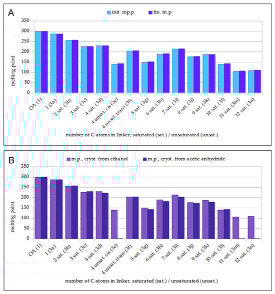 The dependency between the melting point of AcOADs (3a–3n) and the number of carbon atoms in the linker joining two triterpene moieties: (A) AcOADs crystallized/precipitated from ethanol; (B) AcOADs crystallized from ethanol (light violet bars) and acetic anhydride (dark violet bars). Legend: OA—oleanolic acid (reference compound); sat.—saturated linker; unsat.—unsaturated linker; init. m.p.—initial melting point; fin. m.p.—final melting point; m.p., cryst. from ethanol—melting point of dimer crystallized from ethanol; m.p., cryst. from acetic anhydride—the melting point of dimer crystallized from acetic anhydride.
