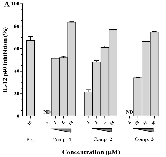 Effect of compounds 1–3 on the production of IL-12 p40 (A) and IL-6 (B) in LPS-stimulated BMDCs at concentrations of 1.0–50.0 μM. The results are shown as inhibition rates (%) relative to the levels observed in vehicle-treated DCs. Pos: SB203580. ND = Not Detected.