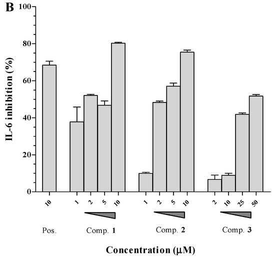 Following this, the effects of compounds 1–3 on the production of IL-6 and IL-12 p40 were assessed at various concentrations ranging from 1 to 50 μM. In these experiments, 4-(4-Fluorophenyl)-2-(4-methylsulfinylphenyl)-5-(4-pyridyl)-1H-imidazole (SB203580) was utilized as a positive control [14]. SB203580 demonstrated a marked ability to inhibit the production of both IL-6 and IL-12 p40, with calculated IC50 values of 3.5 μM and 5.0 μM, respectively (Figure 2). The tested secobutanolides, identified as compounds 1–3, also showed significant inhibitory effects on IL-6 production, with IC50 values determined to be 1.8 μM, 3.4 μM, and 24.1 μM, respectively. Similarly, these compounds exerted strong inhibitory activity against IL-12 p40 production, with IC50 values of 3.1 μM, 2.9 μM, and 16.3 μM, as shown in Table 2.